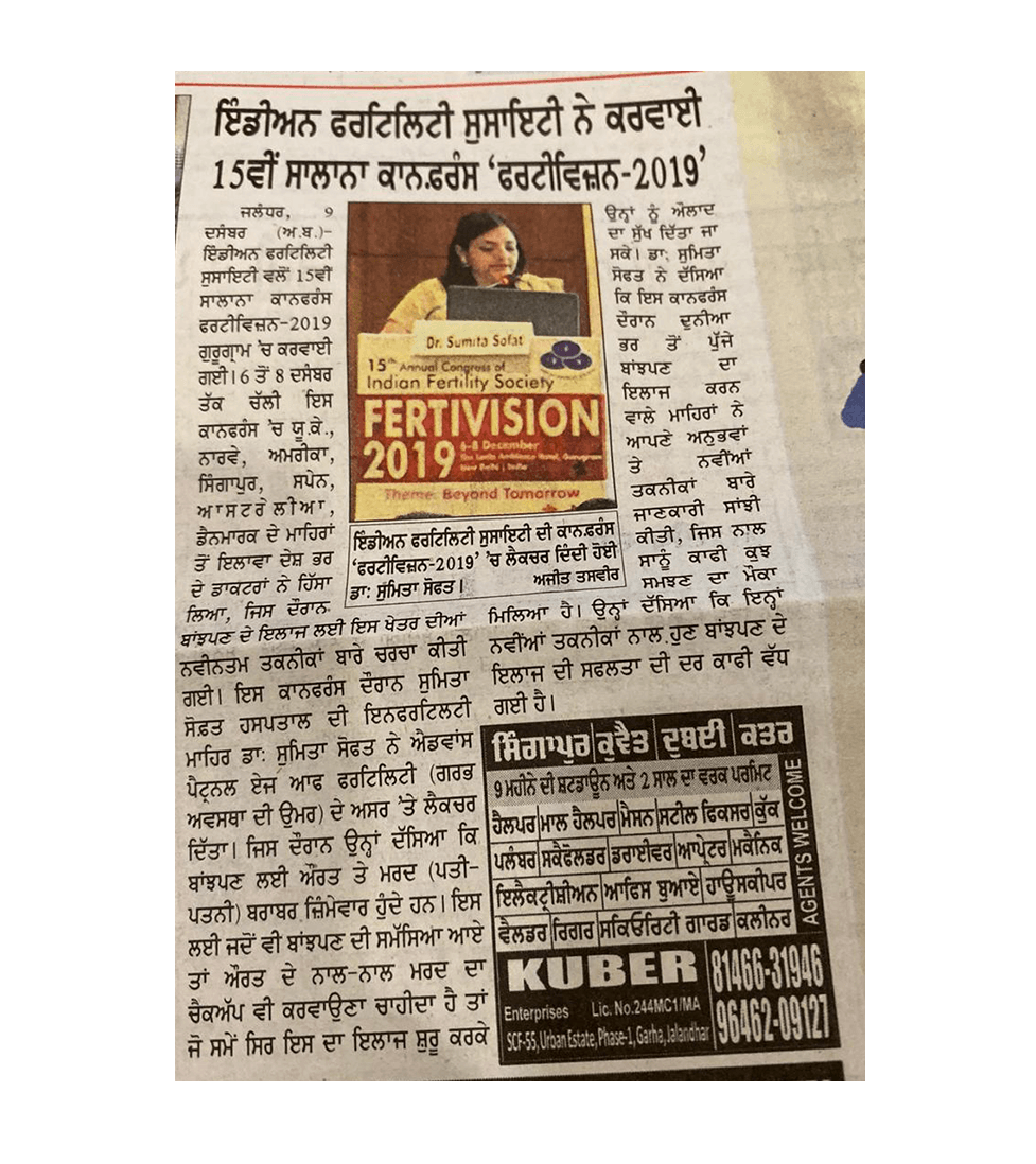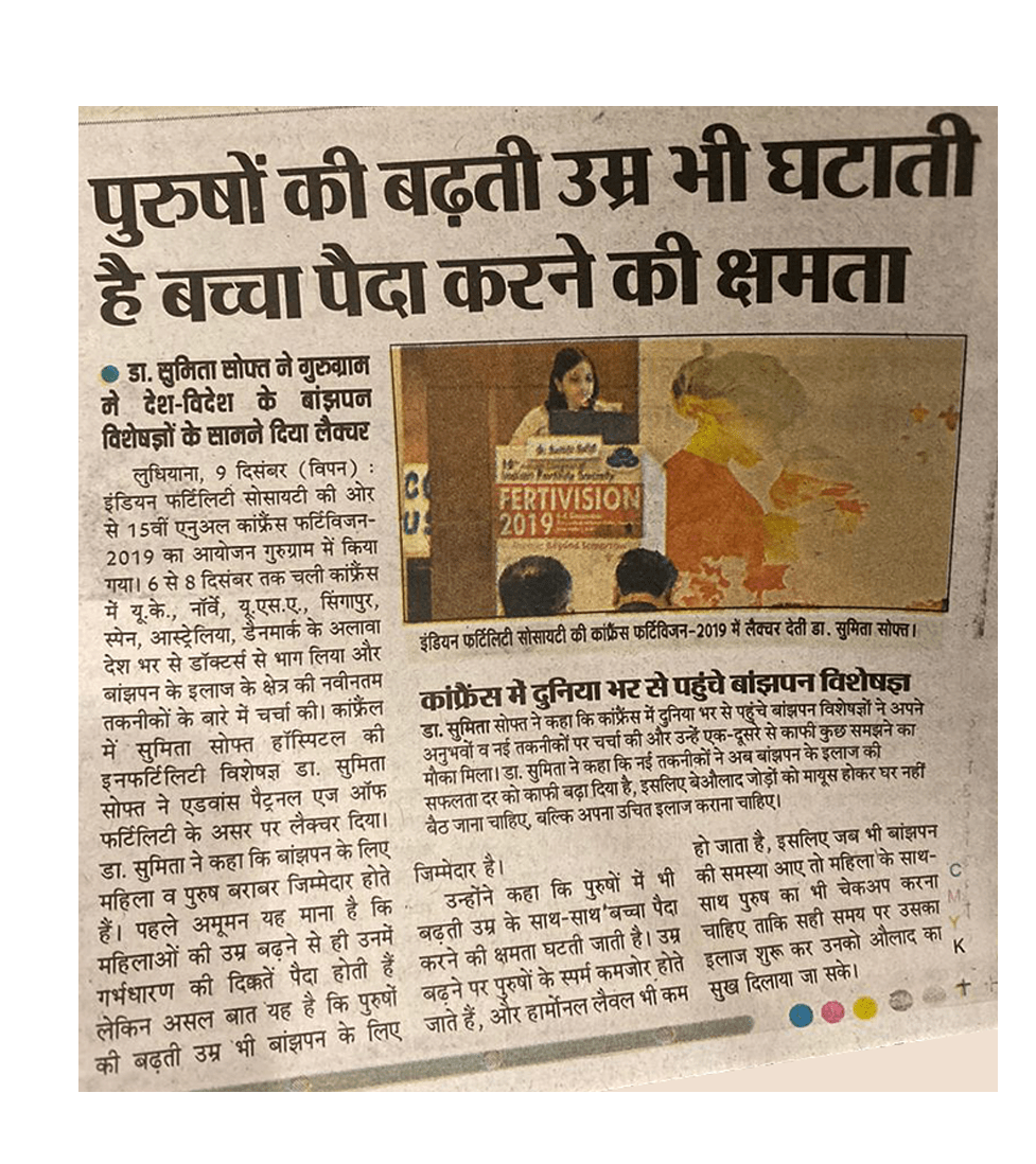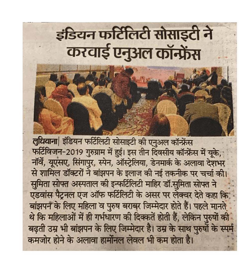 एनुअल कॉन्फ्रेंस फ्रटिवीजन 7 दिसंबर से 9 दिसंबर तक गुरुग्राम में आयोजित किया गया था जिसमें यूके, नॉरवे, यूएसए, स्पैन के अलावा, दुनिया भर के डॉक्टर ने उस कार्यक्रम में भाग लिया जहां उन्होंने बांझपन और उन्नत प्रौद्योगिकी उपचार के बारे में चर्चा की। डॉ. सुमिता सोफत ने एडवांस पैट्रनल एज ऑफ़ फर्टिलिटी के बारे में एक व्याख्यान दिया, जिसमें उन्होंने बताया कि पुरुष और महिलाएं बांझपन के लिए समान रूप से जिम्मेदार हैं।