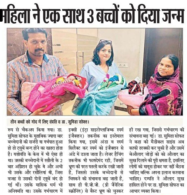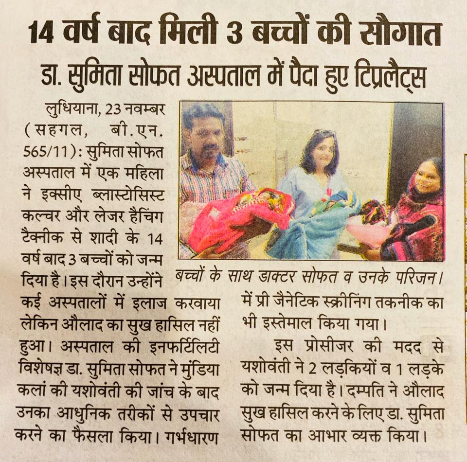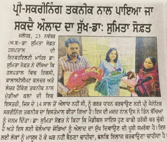 ਡਾ. ਸੁਮਿਤਾ ਸੋਫਤ: ਸੋਫਤ ਹੌਸਪੀਟਲ ਐਂਡ ਵੁਮੈਨ ਕੇਅਰ ਸੈਂਟਰ ਲੁਧਿਆਣਾ ਦੀ ਬਾਂਝਪਨ ਦੀ ਮਾਹਿਰ ਡਾਕਟਰ ਸੁਮਿਤਾ ਸੋਫਤ ਨੇ ਦੱਸਿਆ ਕੇ ਹਸਪਤਾਲ ਵਿਚ ਲੈਸਰ ਹੈਚਿੰਗ, ਇਕਸੀ, ਬ੍ਲਾਸਟੋਸੀਸਟ ਕਲਚਰ ਤਕਨੀਕ ਨਾਲ ਮੁੰਡਿਆਂ ਕਲਾਂ ਦੀ ਇਕ ਇਸਤਰੀ, ਜਿਸ ਨੂੰ 14 ਸਾਲ ਤਕ ਔਲਾਦ ਦਾ ਸੁਖ ਪ੍ਰਾਪਤ ਨਹੀਂ ਹੋਇਆ ਸੀ, ਉਸ ਨੂੰ ਪ੍ਰੀ ਸਕਰੀਨਿੰਗ ਤਕਨੀਕ ਦੇ ਇਸਤਮਾਲ ਨਾਲ ਗਰਬ ਧਾਰਨ ਕਰਵਾਯਾ ਗਿਆ| ਜਿਸ ਦੀ ਮਦਦ ਨਾਲ ਉਸ ਨੇ 3 ਬੱਚਿਆਂ ਨੂੰ ਜਨਮ ਦਿੱਤਾ|