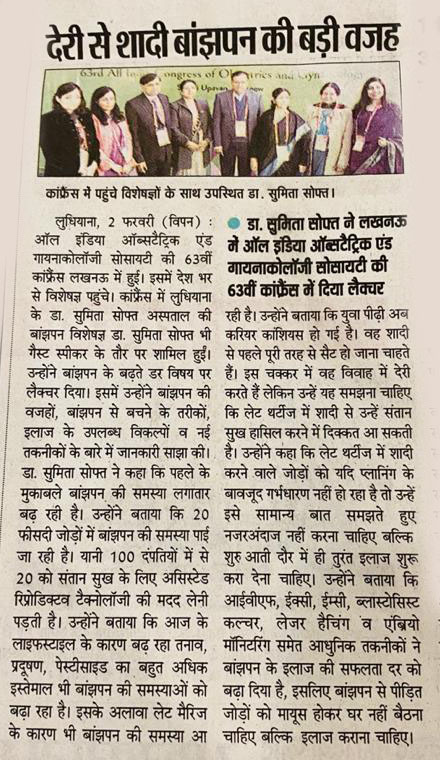 डॉ. सुमिता सोफत: आल इंडिया ऑब्स्ट्रैटिक एंड गायनेकोलॉजी सोसइटी की 63वीं कॉन्फ्रेंस में डॉ. सुमिता सोफत ने अतिथि के रूप में शामिल हुई। उन्होंने बांझपन में वृद्धि के बारे में एक व्याख्यान दिया है। उन्होंने बांझपन के कारणों के साथ-साथ इसके उपचार के बारे में बात की। उन्होंने आगे उल्लेख किया कि प्रदूषण में वृद्धि और कीटनाशकों के उपयोग से बांझपन होता है। आम तौर पर 20% जोड़े बांझपन से पीड़ित होते हैं, सरल शब्दों में 100 में से 20 जोड़े बांझपन से पीड़ित होते हैं। दैनिक जीवन में तनाव और देर से शादी करना इसका मुख्य कारक है।